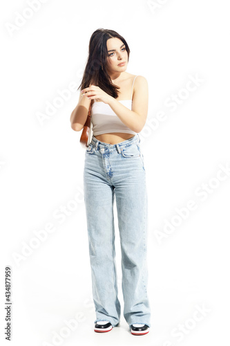 girl, summer, isolated, earring, put on, applying, fashion, clothes, casual attire, woman, full body, sunny, white background, trendy, stylish, fashionable, brunette, caucasian, latin, full-length, person, 1, top, jean, sneaker, eyebrow, blue eye, pretty, attractive, beauty, female, sun, sunlight, studio, cut-out, fashion model, lifestyle, looking away, youth, pursed, serious, standing, modern, adjusting, coiffure