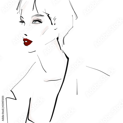 fashion, woman, portrait, face, beauty, style, coiffure, make-up, model, eye, drawing, vignetting, lip, young, stylish, elegant, eyelash, design, beautiful, glamour, art, artwork, background, black, card, clothing, contour, creative, drawn, fashionable, female, girl, graphic, head, illustration, ink, isolated, lady, line, lipstick, look, modern, outline, poster, red, short, hair, vector, white