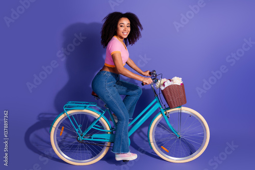 cute, cycling, female, woman, young, girl, bike, bicycle, casual attire, lifestyle, leisure, fashion, model, violet, purple, background, advertising, shopping, promotion, african, american, black, skin, hair, natural, smile, happy, cheerful, pretty, attractive, lovely, exercise, healthy, fitness, active, sport, pedal, relax, fun, joyful, urban, chic, spring, summer, culture, bicyclist, riding, transport, travel