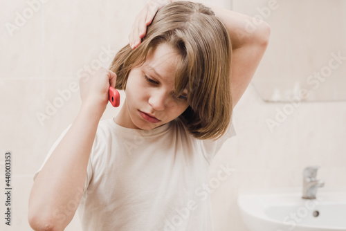 Young teenager boy combing his hair in the morning
