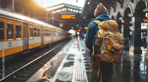 Young traveler man at platform train station, Traveling concept, The passengers are stand waiting for the Station platform, Young man traveler with backpack looking waiting for train