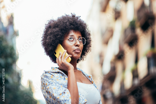 urban, trendy, stylish, phone, african, beautiful, city, calling, mood, fashionable, street, casual attire, discussion, calm, call, ethiopian, device, mobile phone, blurred background, social, barcelona, floral, afro, friendly, conversation, relaxed, horizontal, communication, street, attractive, contacting, woman, summer, portrait, copy space