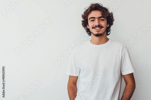 Young Turkish man smiling in white t-shirt on white background. Studio photography. Mockup Template