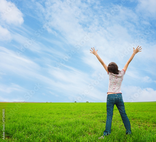 meadow, green, grass, rural, field, blue, sky, scene, landscape, horizon, over, land, spring, nature, colours, idylli, summer, weather, plain, plant, environment, sunlight, sun, simplicity, solitude, lawn, view, day, season, front, clean, growth, woman, alone, showing, young, face, portrait, finger, hand, arm, pose, standing, on, slim, health, girl, cloud, signs