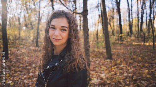 Young woman among trees. Portrait of young attractive female standing in autumn garden and looking at camera