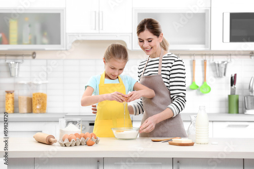 Young woman and her daughter cooking in kitchen