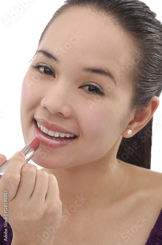 applying, asia, asian ethnicity, beauty, black hair, bodycare, cheerful, cosmetic, earring, grooming, head shot, holding, indoor, jewellery, lipstick, make-up, one person, portrait, preparation, smiling, straight hair, studio shot, toothy smile, vanity, vertical, woman, young adult, photo