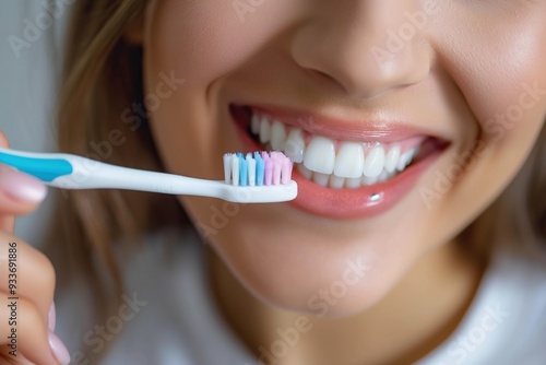Young woman brushing her teeth in bathroom at home. Healthy teeth.
