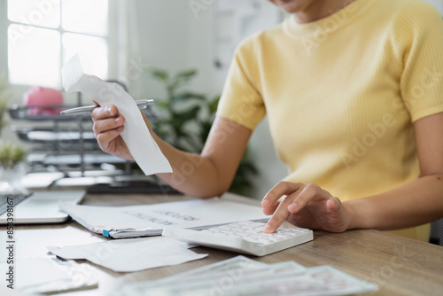Young Woman Calculating Expenses at Home Office Desk for Financial Planning and Budgeting with Calculator, bills, and Documents