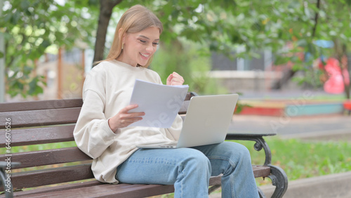 Young Woman Celebrating while Using Laptop and Documents Outdoor