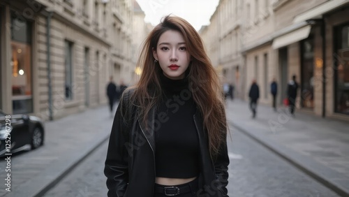 woman, street, cobbled, fashion, confidence, city, daylight, pedestrian, urban, style, sunlight, posing, cool, trendy, scenery, background, casual attire, walking, modelling, beauty, downtown, lifestyle, portrait, scene, people, landscape, atmosphere, europa, architecture, chic, road, friendly, modern, personality, town, glam, hair, expression