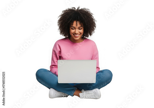 Young woman curly hair a laptop sitting crosslegged, isolated on transparent background