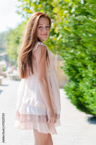 adult, attractive, beautiful, beige, caucasian, cheerful, city, cute, dress, fashion, female, freckle, ginger, girl, green, hair, happy, healthy, lifestyle, long, outdoors, park, people, person, portrait, pretty, red-haired, smile, smiling, soft, standing, street, summer, sunny, urban, white, woman, young, youth