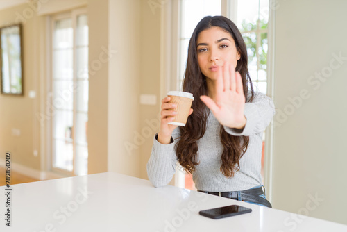 Young woman drinking a cup of coffee at home with open hand doing stop sign with serious and confident expression, defense gesture