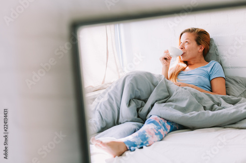 joy, waking, morning, adult, 1, leisure, enjoying, pajama, lying, caucasian, bright, casual attire, woman, hot drink, tea, drink, bed, sitting, beautiful, white, young, happy, cup, attractive, bedchamber, people, warm, home, girl, beauty, female, holding, sleep, person, pretty, lifestyle, relaxation, room, resting, relaxing, happiness, day, indoor, comfort