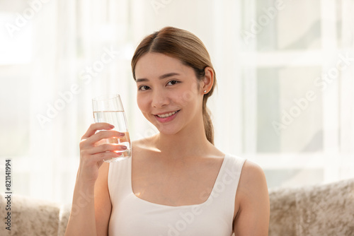 Young woman enjoying a refreshing glass of water at home. Bright and cheerful indoor setting conveys a healthy lifestyle.