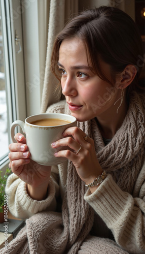 woman, hot drink, drink, cosy, sweater, indoor, window, contemplation, relaxation, lifestyle, warmth, silhouette, fashion, young adult, morning, afternoon, comfort, intimate, thought, mug, smiling, happiness, serene, charming, portrait, still life, home, casual attire, atmosphere, beverage, caffeine, enjoyment, peaceful, elegant, daydreaming, closeup, beauty, hair