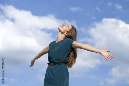 girl, brunette, leisure, blissful, natural, spring, view, day, peace, wellness, life, adult, russian, enjoy, summer, freedom, 1, caucasian, female, smiling, season, time, lifestyle, healthy, hope, young, woman, optimistic, blue, person, joyful, hair, sky, enjoyment, carefree, fresh, raised, calmness, nature, bliss, hand, happy, relaxation, blue skies