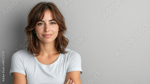 woman, smiling, portrait, happy, confidence, arm, crossed, grey, background, studio, shot, casual attire, 1, person, young, adult, looking, female, beauty, natural, authentic, positive, emotion, expression, lifestyle, cheerful, friendly, approachable, attractive, generation, brown, hair, white, shirt, simple, minimalist, copy, space, head shot