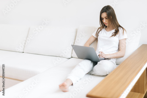 Young woman freelancer working at home on the white couch with laptop in light living room. Girl typing text on laptop. Female working on notebook at home in white interior