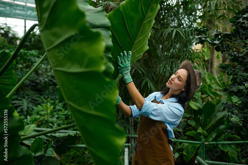 Young woman gardener examining giant tropical plant leaves grown in greenhouse