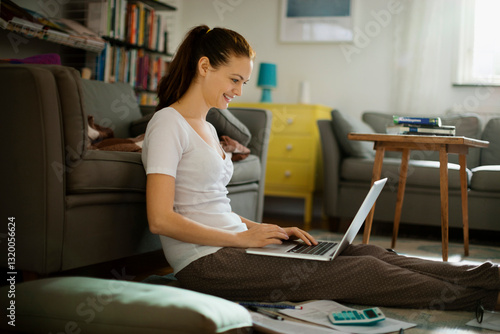 missy, bill, home, living room, laptop, document, finance, smiling, calculating machine, caucasian, nordic, copy space, budgeting, accounting, paperwork, income, expense, savings, serene, focused, concentration, productivity, efficiency, contentment, positive, successful, organised, balance, wellness, joy, happiness, self-assured