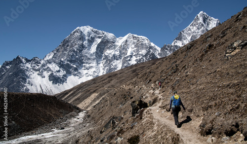 young, woman, hiking, national, park, everest, footed, camp, trek, nepal, 2, people, sport, travel, adult, man, female, caucasian, pair, journey, nature, outdoors, life events, summit, snow-covered, destination, adventure, climber, awe, mountaineering, trekking, blue, sky, wanderlust, traveler, walking, mountaineer, endurance, male, experiencing, landscape, mountain, asia, alpinism