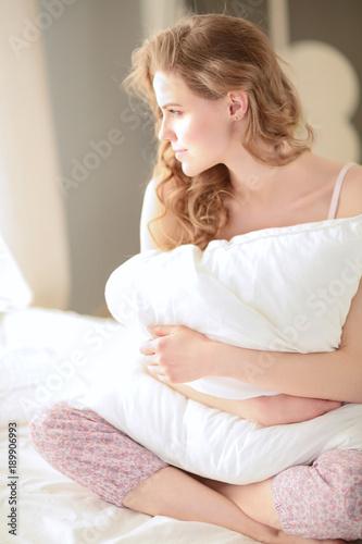 woman, beauty, bed, activity, alone, appearance, asleep, beautiful, bedding, bedchamber, body, casual attire, caucasian, comfort, comfortable, cosy, dream, dreamy, eye, face, fun, glamour, happiness, happy, health, hold, home, house, hug, indoor, interior, joy, morning, night, 1, person, pillow, relax, relaxation, romance, room, to sit, sleep, sleepy, smile, soft, studio, touch, white, woman