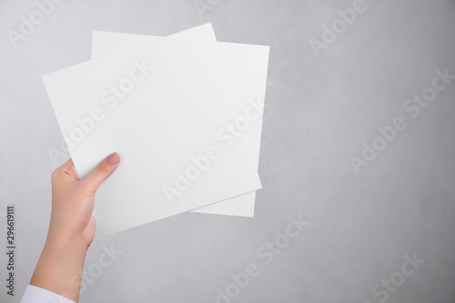 Young woman holding blank paper sheets on light grey background, closeup. Mock up for design