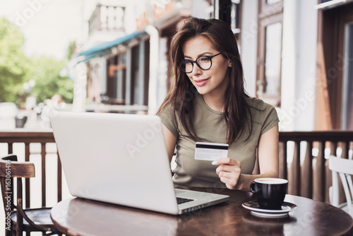 laptop, network, pay, cafes, table, buy, ordering, business, concept, life, paying, cyberspace, enjoy, entering, datum, finance, notebook, card, people, female, smiling, technology, computer, modern, girl, money, shopping, holding, face, woman, person, electronic, store, payment, credit, purchase, information, work, trade, commerce, using, spending, freelance, banking, hand, e-business, online, businesswoman, online shopping