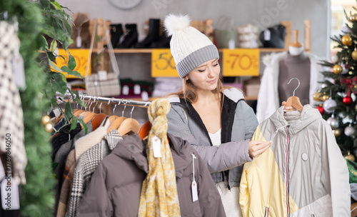 Young woman in a winter hat stands near a rail and chooses jackets, coats and windbreakers at a Christmas sale in a store. Bargain purchases of winter clothes before the New Year