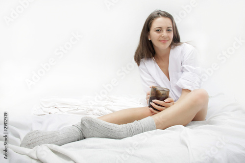 young woman in bed with cup of tea