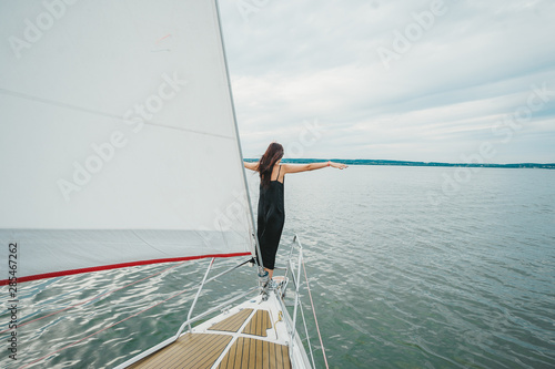 Young woman in black dress enjoying the beauty of the nature on sailing yacht sailing the sea.