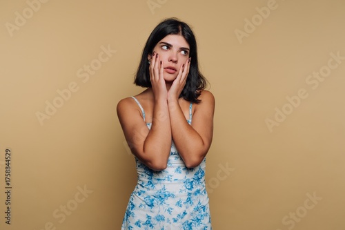 woman, attractive, beautiful, feminine, brunette, young, beige, latin, background, shocked, surprised, scared, fear, dress, floral, thoughtful, contemplation, expression, short hair, casual attire, portrait, emotion, coiffure, beauty, day, person, model, fashion, studio, posing, serious, mood, emotion, hand, chin, look, gaze, thinking, pondering, closeup, lifestyle, youth, innocence, attire, feeling, relaxed