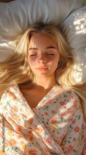 sleeping, woman, relaxation, peaceful, serene, calmness, sunlit, floral, nightdress, blond, bed, indoor, calm, light, rest, cosy, warm, gentle, soft, female, alone, sunshine, dreaming, morning, comfortable, stillness, beauty, hair, lying, face, closed eyes, solitude, elegance, harmony, quiet, dreamy, delicate, feminine, natural, sunlight, young adult