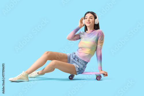 Young woman in headphones with skateboard sitting on blue background
