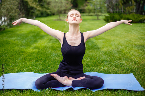 yoga, girl, park, grass, young, female, healthy, people, relaxation, beautiful, nature, beauty, health, fitness, green, caucasian, exercise, lotus, person, body, summer, meditation, white, outdoors, position, vitality, lifestyle, relax, meditating, serene, woman, pose, concentration, wellness, sitting, peace, contemplation, adult, fit, happiness, meditate, sport, balance, slim, forest, tree, peaceful, leisure, happy