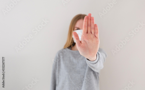 Young woman in protective sterile medical mask on her face looking at camera, stop no sign. The concept of the epidemic of the coronavirus. Focus on the hand, stop gesture