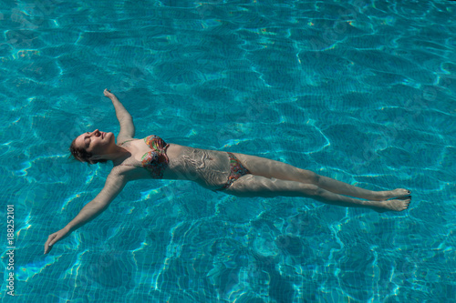Young woman in swimsuit is swimming in pool