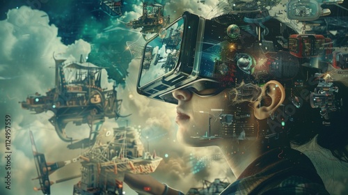 Young woman in VR headset sees futuristic city with airships. Tech and future themes prominent. Unidentified hand in foreground.