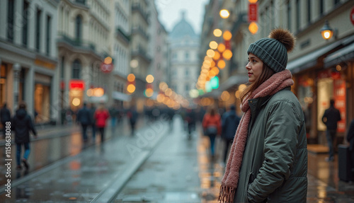 woman, young, street, city, urban, rainy, evening, contemplation, fashion, foulard, coat, smile, stylish, lifestyle, crowd, casual attire, outdoors, vibe, chilly, atmospheric, bokeh, charisma, solitude, warmth, character, interaction, public, life events, adventure, joy, lighting, relaxed, trendy, ambience, cheerful, personality, inspiration, travel, exploration, metropolitan, gathering