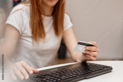 Young woman is holding credit card and using a laptop. Online shopping concept. The girl is doing e-shopping. Young woman on the sofa shopping online with debit card.