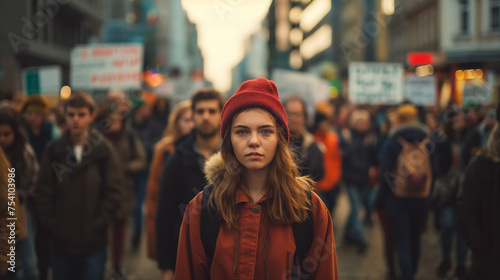 young, woman, leading, demonstration, determined, red, beanie, protest, forefront, focused, gaze, leadership, purpose, activism, crowd, march, cause, racked, youth, commitment, rally, expression, strong, serious, community, involvement, civic, action, movement, social, justice, defiance, bravery, campaign, solidarity, change, resolve, leader