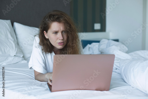 young woman lies and use laptop in bed in the morning. concept online learning, work, shopping