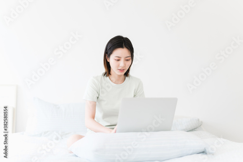 working, freelancer, chinese, laptop, computer, indoor, home, young, woman, bedchamber, bright, plain, clean, beautiful, confident, healthy, room, white, life, way of life, alone, comfortable, leisure, nature, happy, smile, short hair, vest, suspenders, cosy, girl, woman, portrait, daytime, minimalism, cute, optimistic, blank, modern, smile, japanese, asian