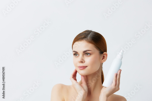 young woman lotion jar clean skin health care isolated background