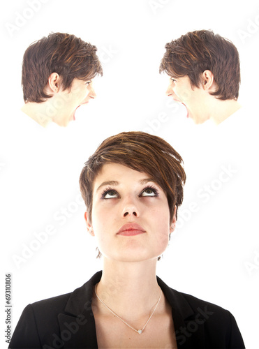 young, woman, good, bad, pretty, background, female, person, girl, adult, caucasian, attractive, drawing, lady, looking, head, expression, casual attire, positive, peace, help, gesture, thinking, choice, innocent, temptation, watching, thoughtful, decision, gesticulate, select, choose, surprised, wondering, decide, alternative, between