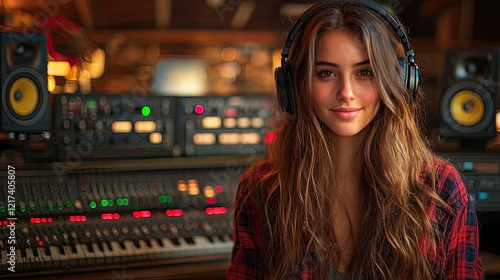 woman, girl, earphones, studio, recording, music, producer, mixer, keyboard, audio, sound, engineer, artist, female, young, beautiful, long, hair, brown, eye, smile, happy, confident, creative, talented, passion, profession, technology, equipment, monitor, speaker, control, panel, desk, light, room, dark, ambience, red, plaid, shirt, style, expression