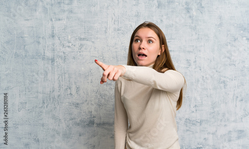 Young woman over grunge wall pointing away
