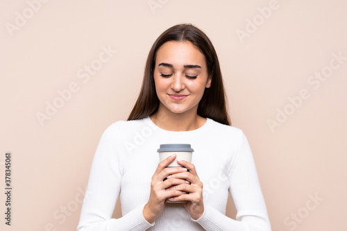 Young woman over isolated background holding coffee to take away